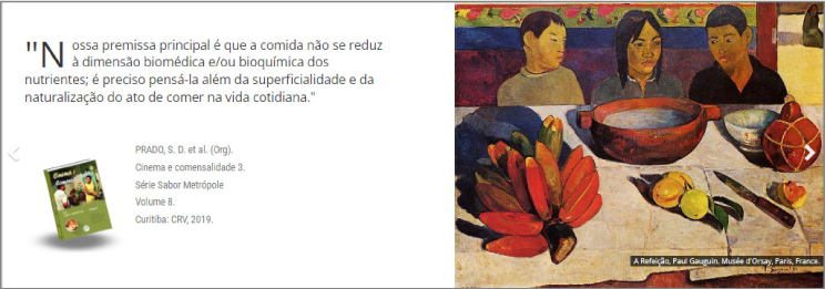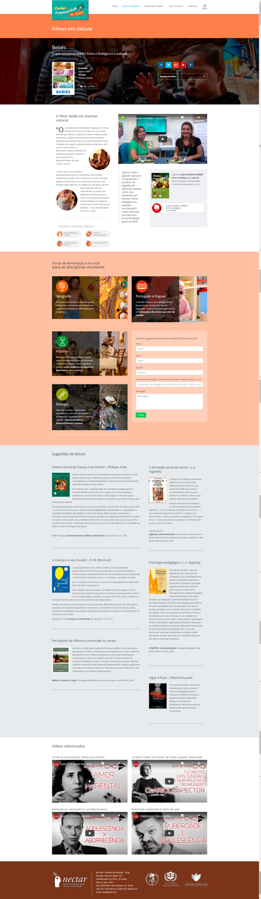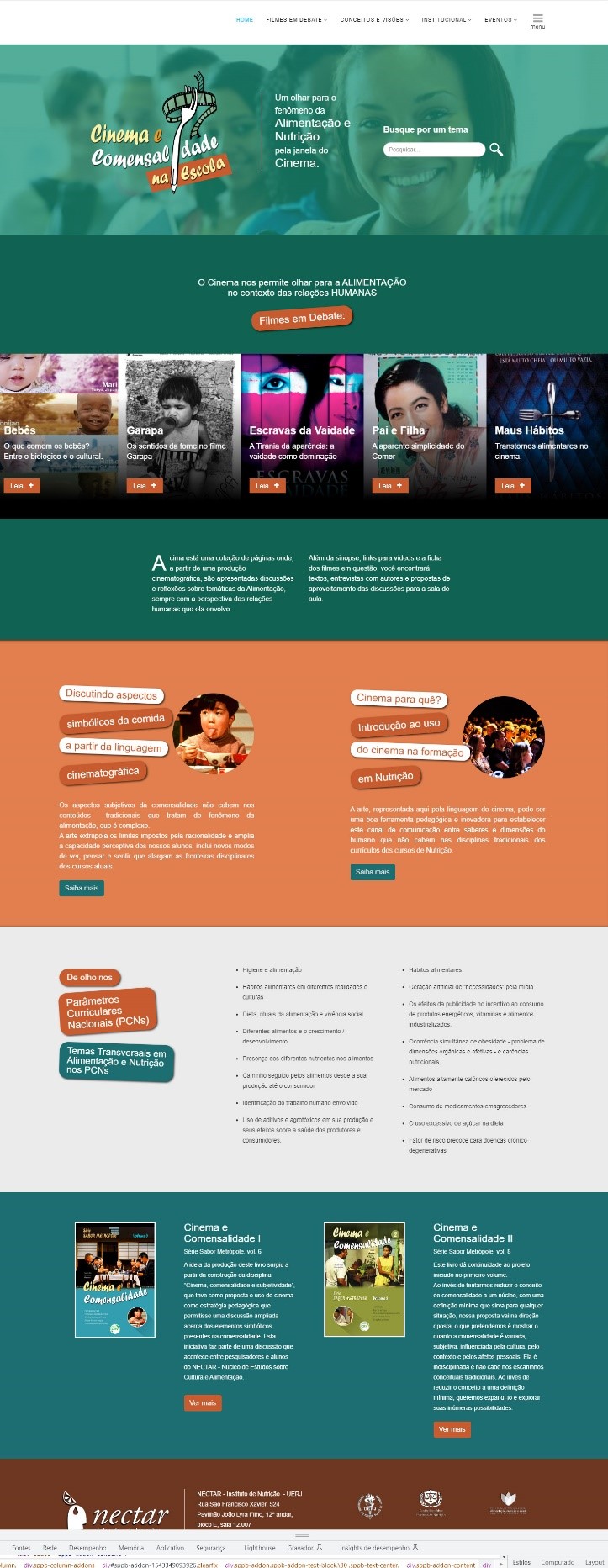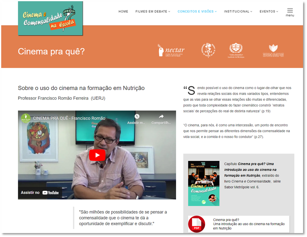 Plataforma web que compôs o projeto de mestrado do PPGANS (programa de pós-graduação em Alimentação, Nutrição e Saúde) UERJ. O site apresenta discussões desenvolvidas no meio acadêmico sobre temas de alimentação, cultura e sociedade, tendo como referência 32 produções cinematográficas. O projeto visa apresentar esses conteúdos ao ensino médio.